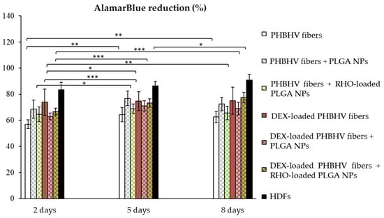| 3 | PHBHV fibers + RHO-loaded PLGA NPs | 0.14 ± 0.03 | 0.50–1.00 | n.s. (vs. #2, #4) |