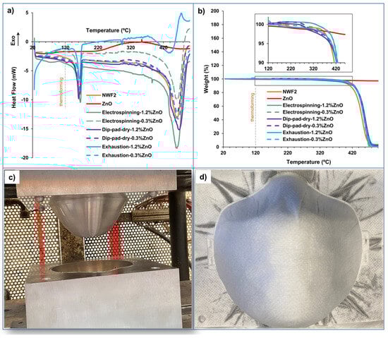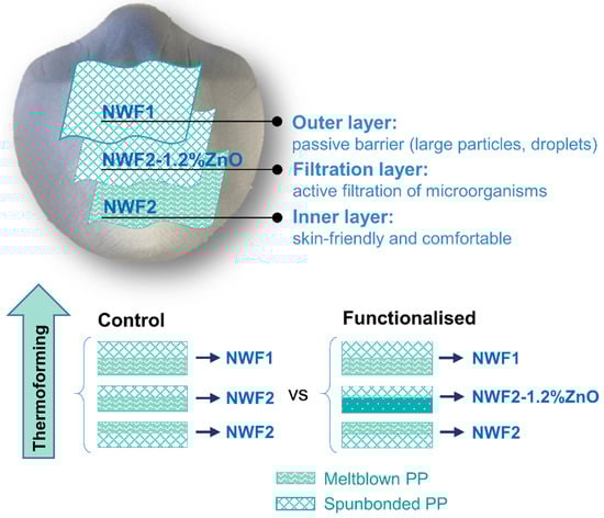 Ferreira, T.; Vale, A.C.; Pinto, A.C.; Costa, R.V.; Pais, V.; Sousa, D.; Gomes, F.; Pinto, G.; Dias, J.G.; Moreira, I.P.; et al. Comparison of Zinc Oxide Nanoparticle Integration into Non-Woven Fabrics Using Different Functionalisation Methods for Prospective Application as Active Facemasks. Polymers 2023, 15, 3499. https://doi.org/10.3390/polym15173499