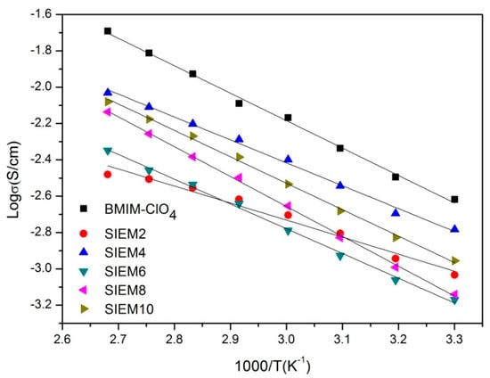 3.2.5. The Relationship between Ionic Conductivity and Temperature