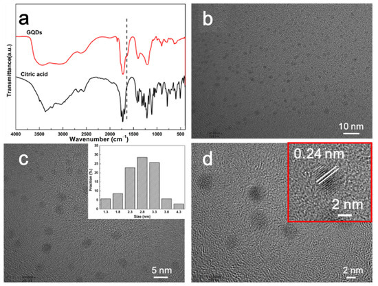 (a) FTIR spectra of GQDs and CA. (b) Low-resolution TEM image of GQDs. (c) TEM image of GQDs with size distribution. (d) High-resolution TEM image of GQDs showing the lattice spacing.