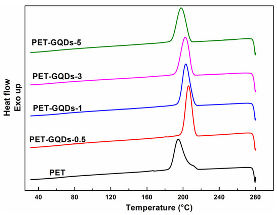 Moreover, the XRD patterns of PET-GQDs-0.5 displayed sharper diffraction peaks on the (100) crystal plane, which suggests that the nucleation effect of GQDs remarkably enhanced the crystallization of the PET matrix. However, it is worth noting that with an increase in the GQDs content from 0.5 wt% to 5 wt%, the characteristic diffraction peaks of the XRD patterns of PET/GQDs nanocomposites became less distinct. This implies that the further increase in nanoscale GQDs content promoted imperfect crystallization, resulting in less clear diffraction peaks of the characteristic crystal planes.