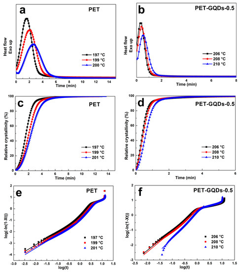 Isothermal crystallization of PET and PET-GQDs-0.5 nanocomposites. (a,b) Isothermal crystallization DSC curves, (c,d) relative crystallinity at different temperatures, (e,f) plots of log[−ln(1 − Xt)] versus logt.