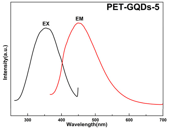The solid-state ultraviolet excitation and emission spectra of PET-GQDs-5 film are shown in Figure 8. As evident from the spectra, at an excitation wavelength of 355 nm, the emission peak occurs at 450 nm, exhibiting a bright blue light. Remarkably, the introduction of GQDs into the PET matrix and subsequent fabrication of the nanocomposite films does not compromise the excellent photoluminescent properties of GQDs. Moreover, the symmetrical emission spectra suggests that the emission wavelength of PET/GQDs nanocomposites is independent of the excitation wavelength, demonstrating excitation wavelength independence.