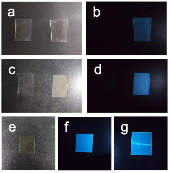 Evolution of different phase fractions for PET/GQDs nanocomposites. (a) Image of PET film and amorphous PET-GQDs-5 film under visible light; (b) image of PET film and amorphous PET-GQDs-5 film under ultraviolet light; (c) image of PET film and crystalline PET-GQDs-5 film under visible light; (d) image of PET film and crystalline PET-GQDs-5 film under ultraviolet light; (e) image of amorphous PET-GQDs-5 film under visible light; (f) image of PET-GQDs- 5 film under ultraviolet light; and (g) image of the PET-GQDs-5 film under ultraviolet light after stress concentration.