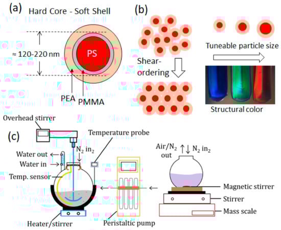 (a) The core–interlayer–shell structure of polymer opal nanoparticles, with layers to scale for particle diameters 100–350 nm. The constituent polymers corresponding to each layer are shown. (b) The shells of these monodisperse particles are deformed as order is induced using melt-shear techniques, where the polystyrene cores are fixed in the solvent-free matrix of poly(ethyl-acrylate) (left). The desired opaline color in the end product can be ‘dialed in’ by control of particle size (right). (c) The polymer opal nanoparticle growth apparatus, with the primary reaction vessel, peristaltic pump, and secondary monomer solution vessel shown.