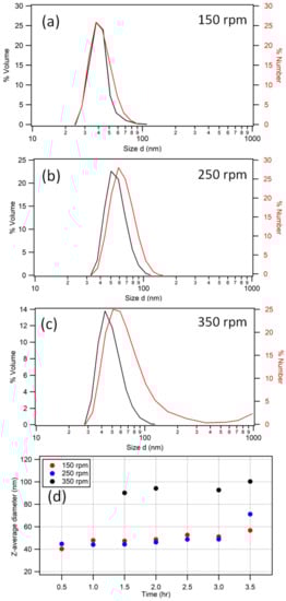 (a–c) The distribution of polystyrene nanoparticles processed at 50 °C for 3.5 h (end) in terms of both volume (black curves) and number (red curves) for 150, 250, and 350 rpm agitation rates. At 350 rpm, a secondary population of large particles is evident; however, from number analysis, this is seen to comprise only a small fraction of the particle content. (d) The z-average-based particle diameters for 150, 250, and 350 rpm measured over time. Points for 350 rpm at early times are out of range due to populations of larger particles.
