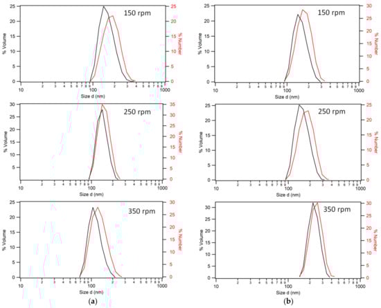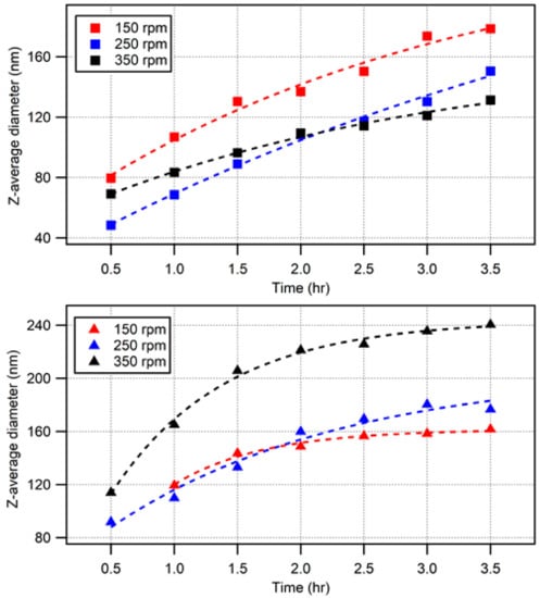 However, the opposite was seen for the 70 °C syntheses, shown in Figure 3b: 240 ± 0.5 nm particles from 350 rpm and 160 nm from 150 rpm. This is a discrepancy worthy of note because previous work [] referred to an optimum stir rate (usually 200–250 rpm) in terms of monomer conversion. Furthermore, when this rate was exceeded, there was a corresponding decrease in particle size. It is not clear why this relationship exists, and investigation into the complex mechanisms at play is beyond the scope of this work. It should be acknowledged that particle growth rate is related to the increase in volume, which goes as a function of the radius cubed. Hence, future work in this area should consider the seed particle stage of the reaction, as well as the initiation stages prior to the dropwise addition of monomer, because calculation of particle number and concentration would be highly beneficial to modeling of the theoretical particle sizes obtained for complete styrene conversion.