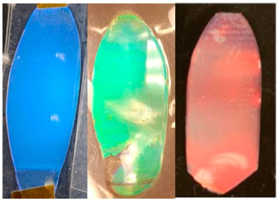 Photographic images in reflected white light showing polymer opal films generated by the BIOS method from the solid batch materials at the end of syntheses, according to the literature protocols. From left to right, the structural colors are blue (core/CIS diameters ≈ 139/184 nm, = 463 nm), green (core/CIS diameters ≈ 175/230 nm, = 549 nm), and deep red (core/CIS diameters ≈ 230/330 nm, as viewed at ≈30° from normal incidence, = 715 nm).