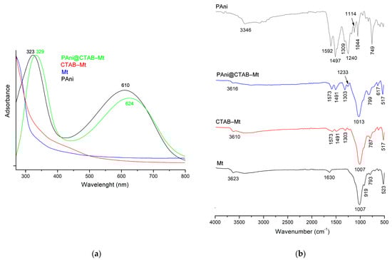 To validate the chemical structures of the PAni, Mt, CTAB-Mt and PAni@CTAB-Mt, UV-vis, FTIR, XRD and XPS analysis were also conducted. The UV-vis spectrum (Figure 1a) of the PAni shows two obvious adsorptions at 323 and 610 nm, which are attributed to the π-π* transition in the benzenoid rings and π-polaron transition in the PAni chain [], respectively. These characteristic bands of PAni are slightly red-shifted in the UV-vis spectrum of the PAni@CTAB-Mt, suggesting the interaction between PAni chain and CTAB-Mt (323 to 329 nm and 610 to 624 nm). In the FTIR spectrum of the PAni (Figure 2b), the bands located at 1592 and 1497 cm−1 should be attributed to the C=C stretching vibration of the quinonoid and benzene rings, respectively. The contraction peak at 1309 cm−1 corresponds to the C-N bond, while the stretching vibration of the -NH+= group and the bending vibration of the C-H bond are located at 1114 cm−1 and 749 cm−1, respectively. These results prove the chemical structures of typical PAni products []. The FTIR spectrum of the Mt shows that the band at 3623 cm−1 is related to the Al-O-H inter-octahedral []. The peaks observed at 1630 cm−1 suggest the possibility of water hydration in the Mt sample (H-O-H stretching) []. The band at 1007 cm−1 is a characteristic of layered silicate minerals and is attributed to the triple degenerate Si-O stretching ν3 (in-plane) vibration. In addition, the band located at 919 cm−1 is attributed to the deformation vibration of Al-OH-Al or Al-Al-OH []; and the band at 793 cm−1 is attributed to free silica or quartz admixtures, always present in natural Mt [,]. Furthermore, the band at 523 cm−1 is attributed to the deformation mode of the Al-O-Si function. Moreover, the comparison of the FTIR spectra of the Mt sample after modification by CTAB shows the appearance of new bands in the spectral range between 1300 cm−1 and 1575 cm−1. As for the PAni@CTAB-Mt sample, the 1007 cm−1 band (Si-O) of Mt is found to be shifted to 1013 cm−1, and the shift of the characteristic absorption bands of PAni is also observed.
