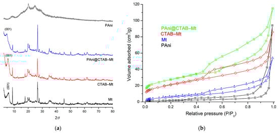 Figure 2a shows the X-ray diffraction patterns of Mt, CTAB-Mt, PAni@CTAB-Mt and PAni. Differences in crystallinity and mineralogical content of the starting samples can be detected between them. The pattern of the Mt sample showed sharp peaks, confirming the results of the montmorillonite clay analysis. The broad and intense peak at 2θ = 6.61° for the Mt sample corresponding to the (001) reflection in Mt modified by CTAB and PAni@CTAB shifts towards larger (d) spaces from 14.33 Å to 15.22 Å to 17.87 Å, respectively. The pattern of the PAni was characterized by lack of crystallinity. Since the conducting polymer material is in the mesoporous form, the formation of infinite non-uniform pores on the surface of the polymer was attributed to the amorphous nature of the product [].