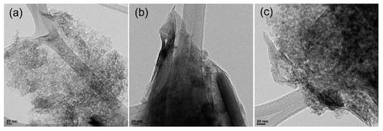 In order to compare the differences in the textural structures of Mt and modified Mt and to see the effectiveness of the modification made, TEM images of the samples were taken and are shown in Figure 5. The TEM image in Figure 5a demonstrates the typical structure of the Mt image. It can be noticed from this image that there is a homogeneous distribution of the clay flakes. The TEM images of the CTAB-Mt in Figure 5b show a homogenous loading of the CTAB inside the Mt material. Comparison of the TEM micrographs in Figure 5a,b confirmed the formation of the CTAB-Mt sample. Moreover, the TEM image in Figure 5c depicts the distribution of the formed PAni assembled on CTAB within the interlayer spaces of Mt, which is compatible with the XRD and FTIR results in this investigation and confirms the formation of the Mt modified by PAni and/or CTAB.