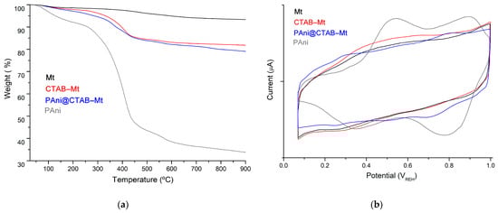 Figure 6b shows cyclic voltammograms (CVs) of samples with potentials ranging from 0.05 V to 1.0 V and scanning rates of 50 mv·s−1. The results show that the CV curve of PAni@CTAB-Mt is clearly dissimilar from that of the tCTAB-Mt sample as a consequence of formation of PAni into the interlayer space. According to this result, the PAni matrix significantly affects the electrochemical behavior of PAni@CTAB-Mt, proving that it is more electrochemically active compared to the CTAB-Mt sample []. Conversely, the results for CTAB-Mt show that the CV curve was relatively comparable to the CV of the Mt sample. However, it displayed a sustained peak current, indicating that CTAB and Mt were fully electrochemically durable.