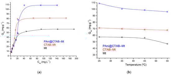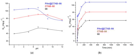 The highest adsorption capacity occurs at pH 6.8, at around 108 mg·g−1, but with increasing pH it decreases to 74 mg·g−1 at pH 12.0 (see Figure 7a). This result suggests that an acidic condition is more favorable for MB removal by PAni@CTAB-Mt. The higher adsorption capacity is due to the fact that the amino groups on the adsorbent are protonated at lower pH values, which makes the surface of PAni@CTAB-Mt positively charged and promotes electrostatic interaction between MB and the adsorbent, hence increasing adsorption capacity. In contrast, the surface of PAni@CTAB-Mt became less positively charged at higher pH values. The existence of OH− in an alkaline environment produces a competitive impact with MB, resulting in a decrease in removal efficiency []. For CTAB-Mt, the adsorption capacity increases with increasing pH, until it reaches approximately 91 mg·g−1, then decreases to 76 mg·g−1 at pH 12.0. Moreover, the same phenomenon occurs when Mt adsorbent is used. Considering the small difference between the adsorption capacity at pH 6 and 7, the optimum pH value was chosen to be 6.8.