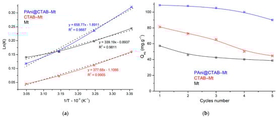 In order to evaluate the capability of these adsorbents for practical applications, five consecutive cycles of MB adsorption were carried out using the three samples (Figure 9b). It was found that the adsorption capacity of PAni@CTAB-Mt decreased by 4.43% after three cycles of utilizing the adsorbents, which is considered to be an insignificant loss of activity. After the fifth adsorption–desorption cycle, the adsorption capacity decreases by 17.23%. Moreover, the results show that CTAB-Mt and Mt were reduced by 45.14% and 32.83% respectively, after the five cycles. The decreases are probably due to the weakening of the electrostatic interactions caused by the continuous cycling. Therefore, the PAni matrix used in the preparation of modified Mt shows remarkable stability and reusability for MB dye adsorption.