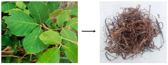 The collected BP fibers are mechanically removed from the branchy stems using a metal teeth. The peeled fibers are then dried in the absence of sunlight for about 7 days in a clean environment. Fibers are drenched in water and surface modification is attained by soaking it in 0.1 M of KOH environment for 30 min. Alkali pre-treatment is performed to eliminate impurities such as wax, oil, etc., from the fibers, while also inducing modifications to enhance their properties [21,22]. Fibers are kept at room temperature for over 10–15 days. Potassium hydroxide was chosen over NaOH in the current study, because it is less alkaline. In Ijuk fibers, KOH–treated fibers generated the highest tensile and stiffness than NaOH [18]. Given that KOH treatment was not performed prior on Butea fibers, KOH with 0.1 molarity was carried on Butea fibers. Fibers mercerized with 0.1 M KOH solution on other fibers demonstrated an enhancement in the mechanical properties [23]. Sisal fibers from the literature showed an improved hydrophobic behavior while treated with same molarity of alkali solution [24]. Alkali-treated fibers are proceeded with vacuum desiccating for 2 days [25]. Figure 1 shows the fibers extracted from Butea parviflora (BP).