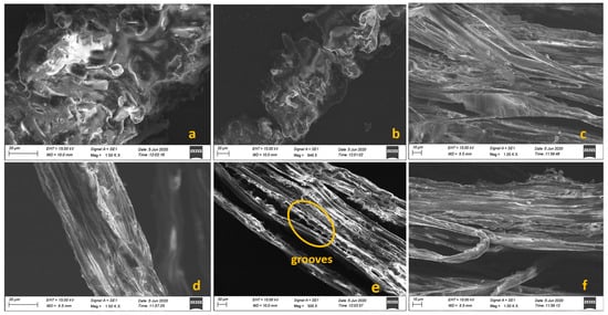 The surface characteristics of both untreated and 0.1 M alkali-treated BP fibers are depicted in Figure 3a–f. SEM analysis is highly used to question the failure approach at the micro level [57]. The presence of small peaks against the long stripes is seen in the raw fiber. Epidermal projections appear on the longitudinal surface. The clouded irregularities in Figure 3a could be part of non-cellulosic debris [58]. This imperfection is removed in the alkalized fibers. It is assumed that the KOH treatment has washed away most of the oil and waxy impurities tied up with the microfibrils, generating a rough interface on the top of the fibers. The elimination of non-cellulosic structures, mainly wax and hemicellulose, could have created fine grooves along the axis. This might greatly improve the expansive adhesion with the matrix interface [41]. The axial arrangement of treated fibrils is more coordinated than the raw fiber.
