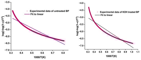 Ea was estimated through linear interpolation of data points between log[−log(1 − α)/T2] and 1000/T. The plot is shown in Figure 5. It speaks more about the aptness of the fibers to be used in composite making. Ea of cellulose fibers show different patterns due to variations in the fiber contents and structure [66].