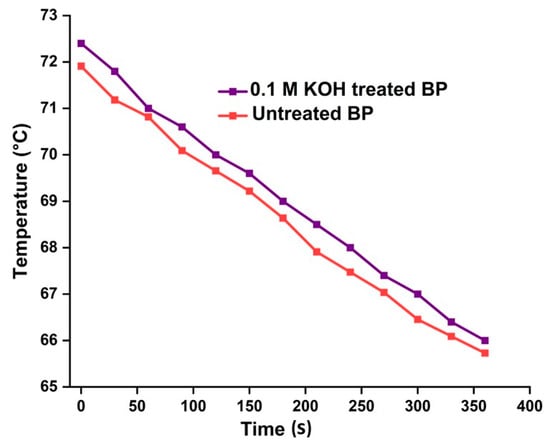 Natural fiber-based materials are highly influential because of their potential insulation behavior. The thermal conductivity (K) of untreated and alkalized BP fiber, found using Lee’s disc method, was K = 0.029 Wm−1k−1 and K = 0.020 Wm−1k−1. Thermal conductivity plots of BP fibers are shown in Figure 6. K values of BP fibers are much lower than wood-based thermal insulation foam (k = 0.038 Wm−1k−1) [68]. The activity was performed at two Lee’s disc setups at room temperature, with the fibers woven tightly without void spaces. The steady temperature of the untreated and 0.1 M KOH-treated fibers are at 73.5 °C and 67.4 °C. Based on the observations, it can be deduced that as the material thickness decreases, its conductivity also reduces, resulting in improved thermal insulation properties [69].