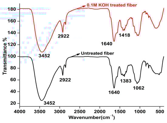 Spectroscopic investigation on fibers gives a detailed account of the structure and presence of constituents binding with the fiber arrangements like cellulose, hemicellulose, pectin, lignin, and others [78]. The FTIR absorption peak of the raw and treated fibers are provided in Figure 7, and the spectroscopic assignments are listed in Table 8. The presence of a prominent band in the range of 3600–3000 cm−1 can be attributed to the stretching of hydrogen-bonded O–H groups in cellulose and/or hemicellulose [79]. A strong peak at 2922 and 2916 cm−1 of fibers is the outcome of the C–H stretching vibration of cellulose [80,81]. Due to the free vibration of the carboxyl group, a peak is visible in both fibers at 1640 cm−1 [44].