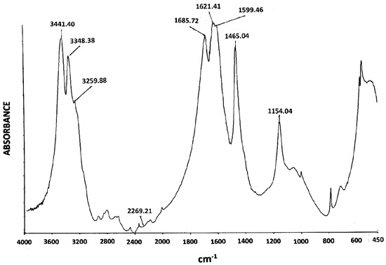 A relatively small absorbance shoulder at this location, however, cannot be observed in the above FTIR spectrum (Figure 2), due to the strong partial overlap of the 1637 cm−1 absorbance with the adjacent CNH deformation absorbance at 1566 cm−1.