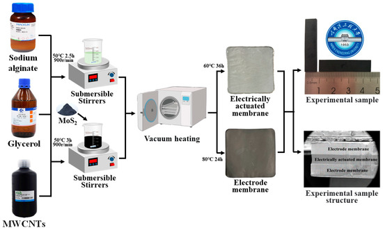 Hence, it is worthwhile to investigate the influence of different doping levels of MoS2 on the performance of the electrode membrane. This study aims to explore a composite electrode doped with MoS2/MWCNTs for the preparation of BMAMs. Through investigating the electrochemical performance of BMAMs, the correlation between their electromechanical properties and electrochemical performance will be further examined.