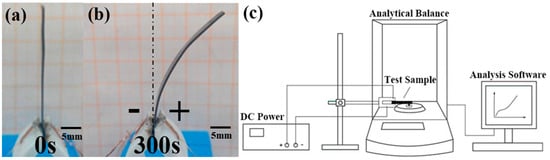 The measurement method for the bending force. (a) Initial state of BMAM; (b) BMAM exhibits a bending phenomenon under the influence of DC voltage; (c) schematic diagram of the experimental platform.
