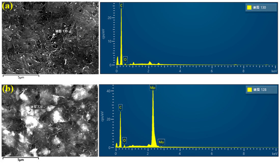EDS results of electrode films with MoS2. (a) EDS testing results of MoS2 with 0 g doping mass; (b) EDS testing results of MoS2 with 1 g doping mass. (The “谱图” in the figure means “Spectrum”.)