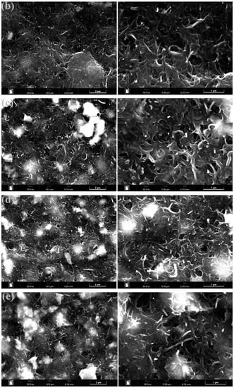 The surface morphology of electrode films with different doping masses of MoS2 was observed using field emission scanning electron microscopy (FIB-SEM). Figure 4 presents the microstructure of electrode films with varying MoS2 doping masses, with the left image magnified 20,000 times and the right image magnified 50,000 times. The observation results reveal significant differences in the microstructure within electrode films of different MoS2 doping masses. Combining the results of the energy spectrum analysis, the following conclusions can be drawn: when the doping mass of MoS2 is 0 g, there are no MoS2 particles present on the surface of the electrode film; when the doping mass of MoS2 ranges from 0.2 g to 0.5 g, a small amount of MoS2 is adsorbed on the surface of the electrode film; when the doping mass of MoS2 ranges from 0.5 g to 1.5 g, a greater amount of MoS2 is adsorbed on the surface of the electrode film; when the doping mass of MoS2 ranges from 1.5 g to 2 g, there is no significant increase in the amount of adsorbed MoS2 on the surface of the electrode film. This indicates that the network structure formed by MWCNTs has a certain limit to the adsorption of MoS2. When the doping mass of MoS2 exceeds 2 g, the adsorption capacity of this network structure tends to saturate, and it cannot adsorb more MoS2 particles.