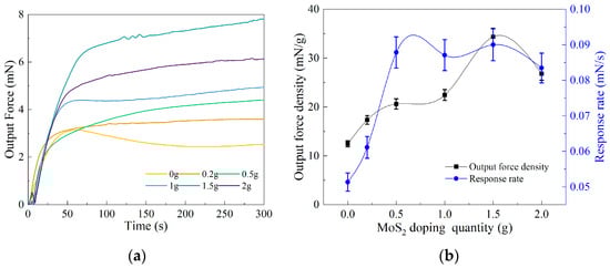 In the experimental process, we measured the output force of BMAM doped with different quantities of MoS2 using a self-built experimental platform. The duration of the experiment was 300 s, during which we collected 600 data samples. These data were subjected to polynomial fitting using Origin 2021 9.8 software. Through the analysis of the fitted data, we obtained the line graph depicting the output force of BMAM doped with different quantities of MoS2 over the specified time period (as shown in Figure 5a). From the graph, it can be observed that the BMAM reached their maximum output force in approximately 60 s. Figure 5a illustrates the relationship between output force magnitude and time. The slope at each point on the curve represents the rate of change in the output force over time, which we refer to as the output force response rate. Using the Origin2021 software, the maximum average slope of the curve was determined, representing the response rate for the given doped mass. Furthermore, we calculated the ratio of the maximum output force to the mass of the BMAM, resulting in the output force density, which represents the maximum output force provided by the BMAM per unit mass. By plotting the curves of the output force density and the response rate (as shown in Figure 5b), we were able to observe the variations under different doping ratios.