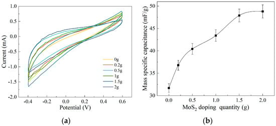 Electrochemical testing results of electrode membranes: (a) CV curve of electrode film doped with different masses of MoS2; (b) MoS2 doping with different masses on the mass specific capacitance.