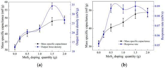 To investigate the influence of the electrochemical properties of electrode films on the performance of output force, we analyzed the variation patterns of specific capacitance, output power density, and output power response rate by doping MoS2 electrode films with different masses. Figure 7a reveals that the specific capacitance and output power density of the electrode films exhibit a positive correlation with the doping mass of MoS2, albeit with different growth rates. Within the doping mass range of 0 g to 1 g, the growth rates of both parameters are relatively similar. However, when the doping mass reaches 1 g to 2 g, the growth rate of specific capacitance becomes slower, while the output power density shows an increasing–decreasing trend. Figure 7b demonstrates that the specific capacitance and output power response rate of the electrode films also exhibit an overall positive correlation with the doping mass of MoS2. Within the doping mass range of 0 g to 0.2 g, both parameters increase as the doping mass increases, with similar growth rates. As the doping mass ranges from 0.2 g to 0.5 g, the growth rate of the output power response rate significantly increases, surpassing that of the specific capacitance. Meanwhile, within the doping mass range of 0.5 g to 2 g, the growth rate of specific capacitance steadily rises, while the output power response rate remains relatively unchanged, especially with a declining trend between 1.5 g and 2 g of doping mass.