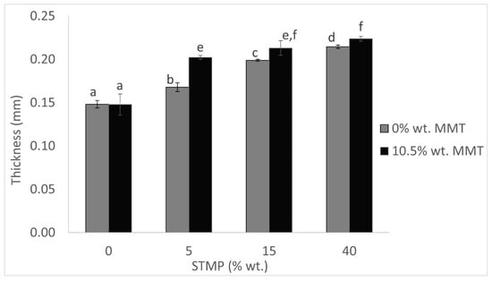 STMP crosslinking and MMT addition effect on film thickness. Data are presented as the average ± standard deviation. Groups that do not share a letter have a statistically significant mean difference (p < 0.05).