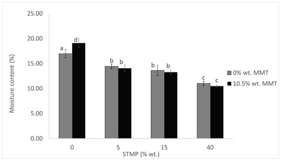 STMP crosslinking and MMT addition effect on film moisture content. Data are presented as the average ± standard deviation. Groups that do not share a letter have a statistically significant mean difference (p < 0.05).