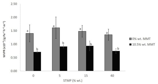 STMP crosslinking and MMT addition effect on film water vapor permeability rate. Data are presented as the average ± standard deviation. Groups that do not share a letter have a statistically significant mean difference (p < 0.05).
