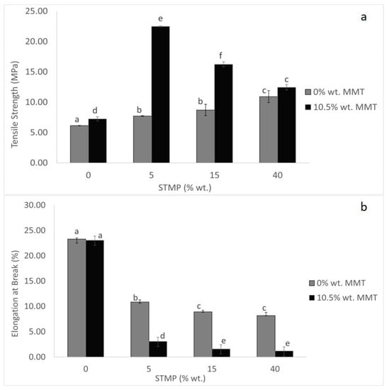 STMP crosslinking and MMT addition effect on film tensile strength (a) and elongation at break (b). Data are presented as the average ± standard deviation. Groups that do not share a letter have a statistically significant mean difference (p < 0.05).