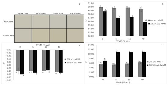 STMP crosslinking and MMT addition effect on film color (a), lightness (L*) (b), greenness (a*) (c), and yellowness (b*) (d). Data are presented as the average ± standard deviation. Groups that do not share a letter have a statistically significant mean difference (p < 0.05).