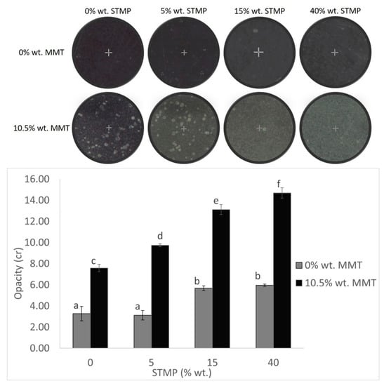 (Up) Photographs showing the STMP crosslinking and MMT addition effect on the film transparency. (Down) STMP crosslinking and MMT addition effect on the film opacity values. Data are presented as the average ± standard deviation. Groups that do not share a letter have a statistically significant mean difference (p < 0.05).