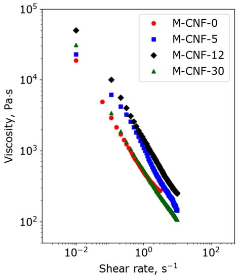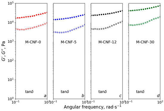 The rheological properties of the prepared dispersions were measured using a rheometer PHYSICA MCR302 (Anton Paar, GmbH, Graz, Austria) equipped with a CP25–2 cone and plane cell (diameter of 25 mm, a cone angle of 2°, and a gap of 0.5 mm) at a constant temperature of 25 °C. Shear stress measurements were carried out at an increasing shear rate in the range from 10−1 to 10 s−1. The angular frequency sweep tests were performed at the frequency range of 0.1 to 100 rad⋅s−1 at a strain amplitude value within the (LVE) region: 0.1%, 0.04%, 0.05%, and 0.03% for M-CNF-0, M-CNF-5, M-CNF-12, and M-CNF-30, respectively (Figure S1).