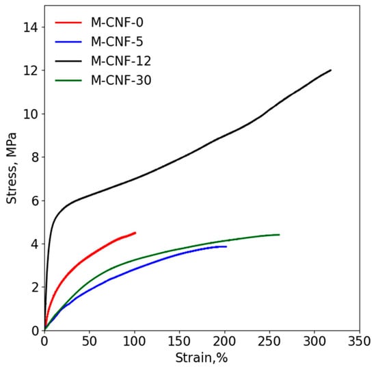 It is also interesting to note that the shape of the stress–strain curve demonstrates that the mechanical behavior of the M-CNF-0 sample is common for thermoplastic polymers, while that of the M-CNF-5 and the M-CNF-30 is common for elastomeric ones. The mechanical behaviors of M-CNF-12 are typical of thermoelastomeric polymers. This allows one to suggest the existence of two sub-networks, both of them significantly affecting the mechanical behavior. The first is the chemically crosslinked network of M-CNFs, while the second is the physically crosslinked network of pDES based on ionic interactions between choline chloride and polyacrylic acid.