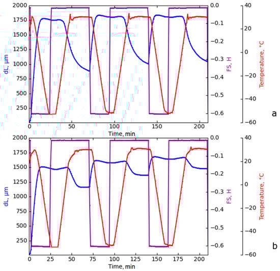 Cyclic thermomechanical tests of the samples: M-CNF-0 (a), M-CNF-12 (b) in the DMA mode at FS = 0.6H.