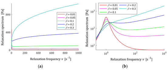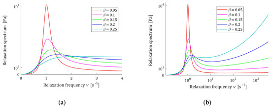 Relaxation frequency spectrum (13) of the fractional Maxwell model (4) for , , elastic modulus , relaxation time and frequency range , where (a) and (b) .