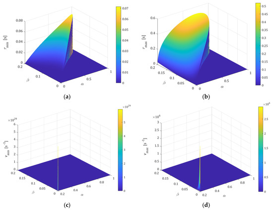 If , then Equation (A16) has two real roots, and one of them is double. It may be proved that single root is negative. Even if the double root is positive, the function , whence also derivative (A12), is positive on both sides of the root, being an inflection point (i.e., saddle point) of the function . Thus, the respective relaxation frequency and time are the inflection points of the monotonically increasing and decreasing spectra and , respectively. Combining the spectra monotonicity for , with the monotonicity in case yields Proposition 4 with inequality (30), resulting directly from (A19), (A17), and (A18).