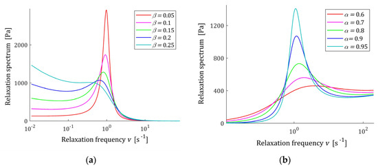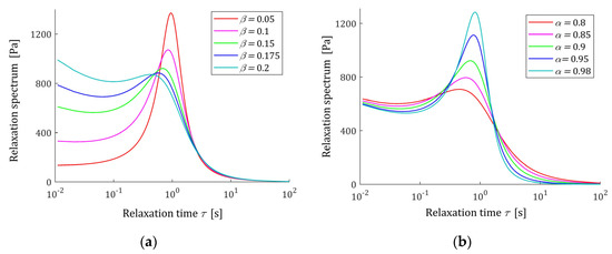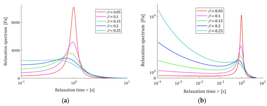 Fractional Maxwell and Kelvin–Voight models are probably the most known fractional rheological models, similarly as for integer order differential viscoelastic models [2,4,5]. However, a deep insight into the complex behavior of polymers was also provided by the viscoelastic relaxation spectrum [11,19,20]. The relaxation spectrum is vital for constitutive models and for the insight into the properties of a viscoelastic material, since from the relaxation spectrum other material functions used to describe rheological properties of the material can be uniquely determined. Therefore, the spectrum is commonly used to describe, analyze, compare, and improve the mechanical properties of polymers [20,21,22,23,24].