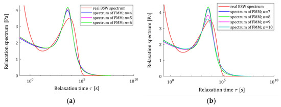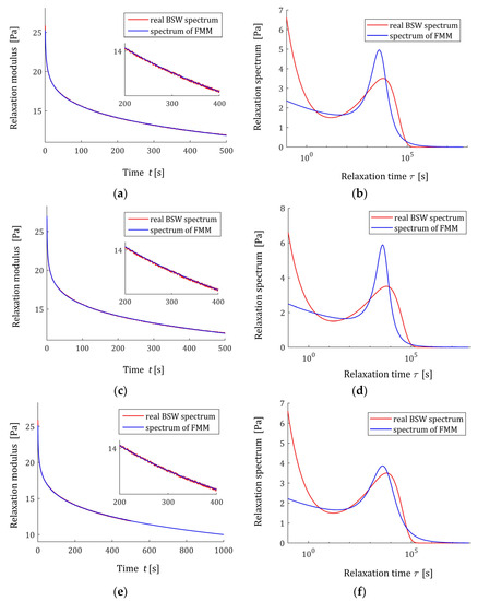 Next, the applicability of the continuous spectrum of FMM to describe Baumgaertel, Schausberger, and Winter (BSW) [26,27] and Gauss-like relaxation spectra was examined. The BSW spectrum is often used to describe rheological properties of various polymers; for example, polydisperse polymer melts [28,29], polymethylmethacrylate (PMMA) and polybutadiene (PBD) [30], and polymer pelts [31]. Gauss-like distributions were used to describe rheological properties of, e.g., poly(methyl methacrylate) [32], polyethylene [33], native starch gels [34], polyacrylamide gels [35], and carboxymethylcellulose [36].