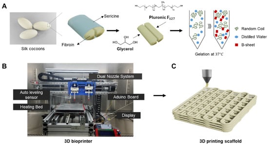 Schematic representation of this study. (A) Development of the silk fibroin-based bioink for 3D printing, involving modification of the physical properties of ink with different glycerol concentrations. (B) Extrusion-based 3D bioprinter. (C) 3D bioprinting with silk-based bioink.