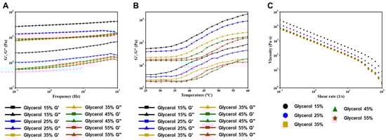 Rheological properties of silk-based bioinks with varying glycerol content. (A) Frequency-dependent storage modulus (G’) and loss modulus (G”) of the bioink formulations. (B) Temperature sensitivity of silk-based hydrogels. (C) Flow characteristics of different bioink formulations. Shear-thinning analysis according to each glycerol concentration.