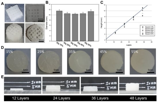 Evaluation of printing ability at different glycerol concentrations. (A) 3D printing in various scaffold forms. Printing of disk-shaped constructs: Printing of disk-shaped constructs with standardized dimensions (diameter: 15 mm, height: 10 mm). (B,D) Diameter analysis of 3D-printed outputs: Graph illustrating the diameter of 3D-printed outputs for each glycerol concentration. (C,E) Height analysis of 3D-printed outputs: Graph demonstrating the height of 3D-printed outputs for each glycerol concentration.