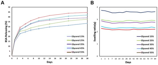 In all experimental groups, there was a rapid release of BSA during the first week, followed by a gradual release over the next 20 days (Figure 6). Notably, the rate of BSA release was influenced by the glycerol concentration in the hydrogel. Higher glycerol concentrations resulted in faster BSA release, while lower glycerol concentrations exhibited relatively delayed release patterns. This observation may be attributed to the hydrophilic nature of glycerol. Hydrogels with higher glycerol concentrations have a greater affinity for the surrounding phosphate-buffered saline (PBS), resulting in more pronounced interactions and thus facilitating the faster release of BSA from the hydrogel matrix. These results indicate that the release properties of the silk-based hydrogel can be modulated by adjusting the glycerol concentration, thus providing control over the release kinetics of encapsulated bioactive molecules such as BSA. This knowledge is valuable for tailoring the delivery of bioactive substances in various biomedical applications.