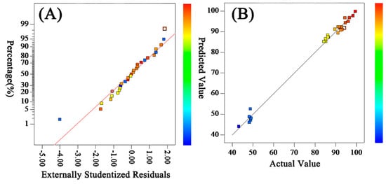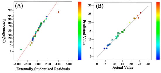 A residual is essentially the difference between mechanism and model predicted value (fitting value) []. It is often used to verify the hypothesis of the model, to detect outliers, and then to facilitate the modification of the model []. In the absence of outliers, residuals should conform to the normal distribution, and the points in the residuals’ distribution should be as straight as possible. The normal distribution of residuals in this model is shown in Figure 1A. Most of the experimental points are evenly distributed on or near the straight line, which shows that the residual obeys normal distribution with few outliers and that the fitting of the model was accurate. The comparison between the predicted and experimental values of the model is shown in Figure 1B. Most of the experimental points are on or near the straight line. The predicted values are close to or equal to the measured values, which proves that the model was suitable.