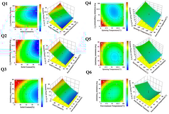 The reliability of the model was analyzed and the results are shown in Table 4. The value of the complex correlation coefficient, which was closer to one, would indicate that the fitting degree of the equation was good []. The model was 0.9872, which showed that the fitting regression equation was reasonable and reliable. The prediction effect of the model are indicated by the modified complex correlation coefficient and the predicted complex correlation coefficient. The larger the coefficient was, the better the prediction effect obtained []. The coefficien of the model was greater than 0.95, indicating that more than 95% of the values could be explained by the model. Since AP = 31.1638 > 4, accidental errors had little effect on the experimental results and the model could predict the entire process accurately enough. CV = 7.02% < 10%, indicating fewer abnormal data. The binary regression equation fitted well and had high reliability. It could be used to predict the relationship between membrane permeation flux and solid content, spinning temperature, post-treatment time, and post-treatment temperature.
